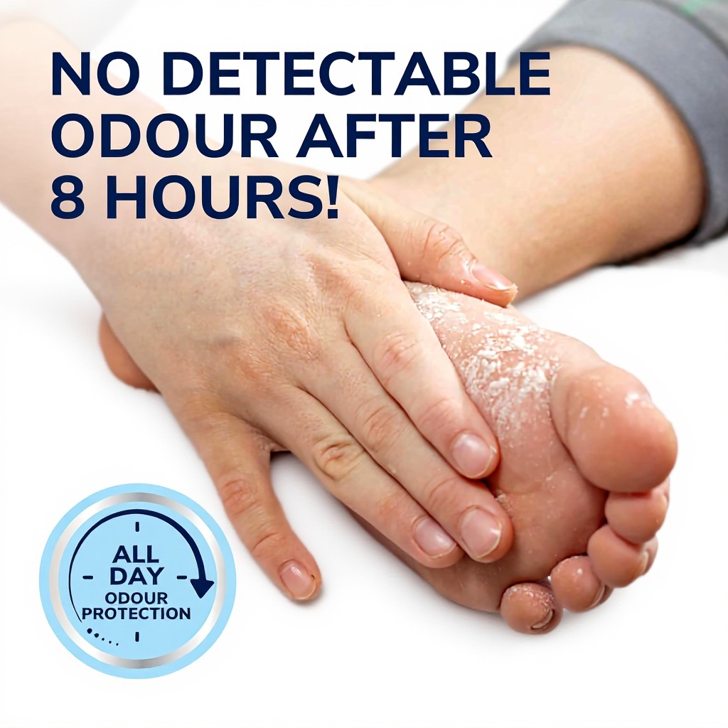 Clinical testing shows the powder provides up to 48 hours of odour protection. The effectiveness may vary based on individual foot chemistry and activity levels.