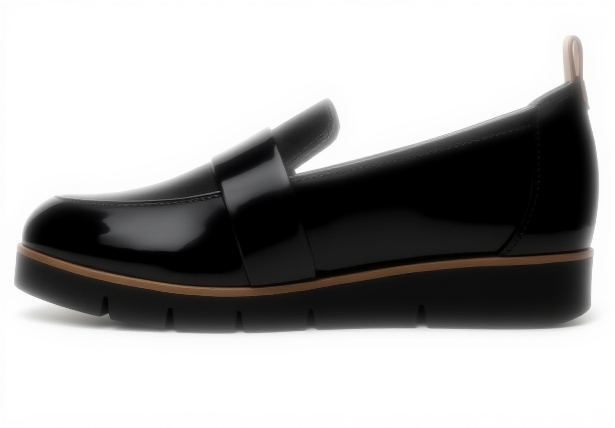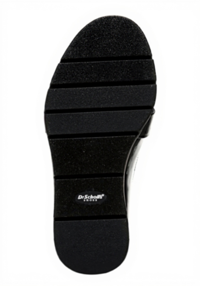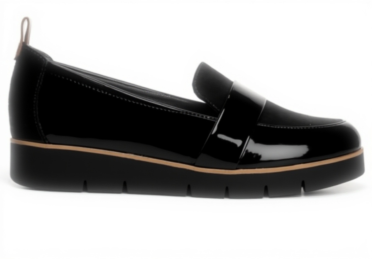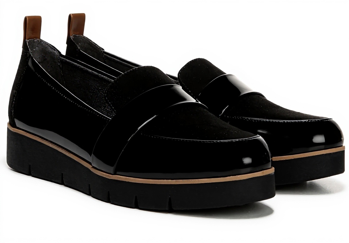 This women’s platform loafer from Dr. Scholl’s features a sleek black patent microfiber upper, often made from recycled materials, paired with a soft feel-good lining for immediate comfort. It includes a faux leather back pull tab for easy slip-on wear and anatomical cushioning technology in the insole, providing exceptional support and flexibility for all-day use.