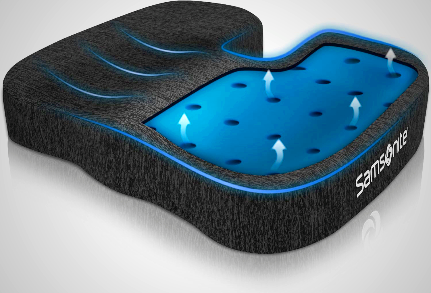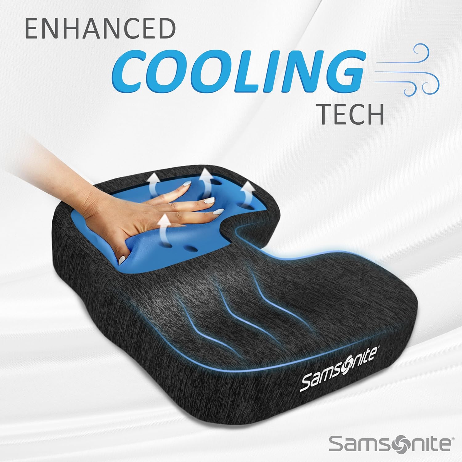 Experience superior comfort with the Samsonite Gel Infused Seat Cushion. This ergonomic cushion is designed to relieve tailbone pressure and provide coccyx support, making it ideal for sciatica relief. Made with memory foam and cooling gel, it ensures lasting comfort for office chairs, car seats, desks, and gaming chairs. Available in multiple colors including Black, Grey, and cooling gel options to suit your needs.