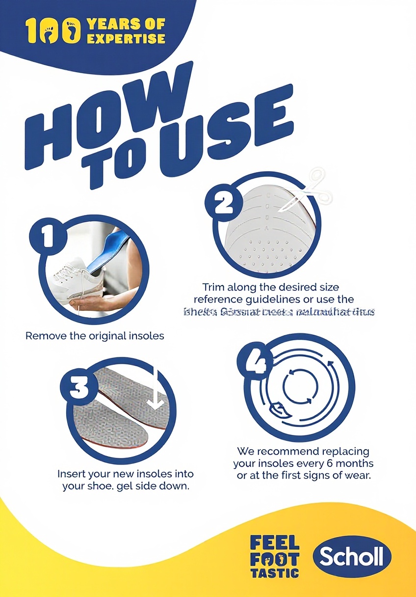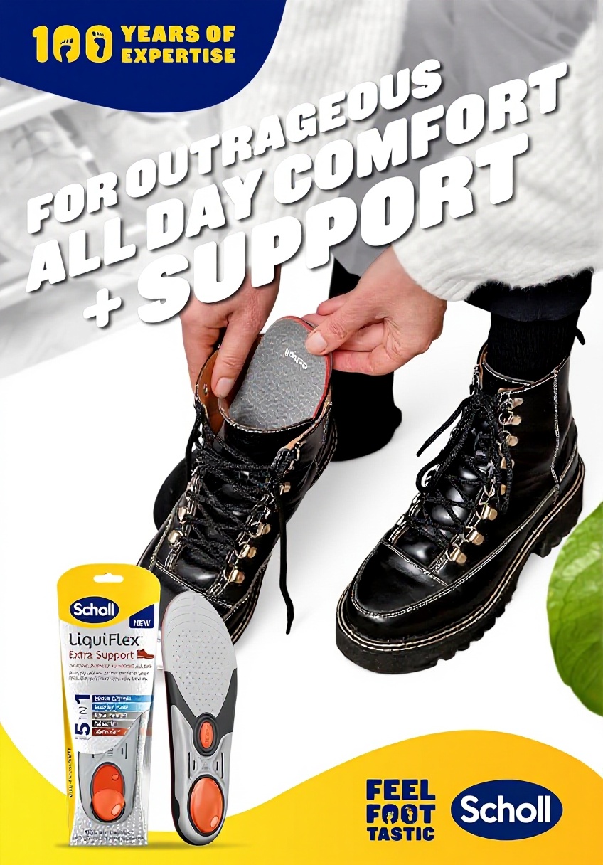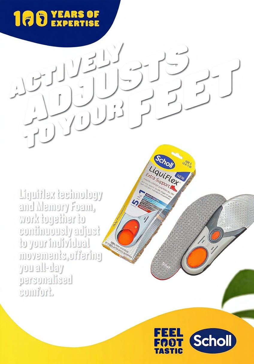 Scholl LiquiFlex Extra Support Insoles are engineered with a 5-in-1 design that includes memory foam, arch support, GelActiv cushioning, and odor-resistant technology. Developed in collaboration with podiatrists, these insoles adapt to your foot shape and movements, offering enhanced shock absorption and comfort for everyday use.