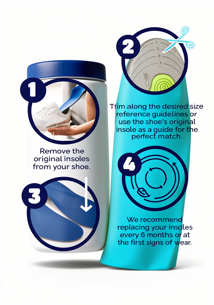 Measure your foot against the insole and trim along the marked lines using scissors. Ensure you follow the size guidelines for a precise fit that maintains the gel support features.